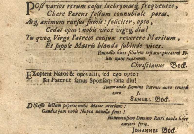 Widoczne są trzy osobne wpisy, każdy zakończony imieniem i nazwiskiem w formie "Christianus Bock.", "Samuel Bock." i "Johannes Bock." - to formuła własnoręcznych życzeń/dedykacji. W linii przy Samuelu Bocku jest dopisek "Honorado Domino Parentis...", a więc zwrot do "czcigodnego Pana Ojca", co potwierdza, że piszą jako dzieci do ojca. Tekst Christianusa to życzenia, aby ojciec po "rozlicznych przypadkach i łzach" mógł spokojnie założyć małżeńskie łoże, odzyskał ducha i długo żył, a panna małżonka była dla niego czułym wsparciem. Samuel pisze, że inni niech pragną dzieci i dóbr, on zaś życzy przede wszystkim, by ojciec i jego małżonka pozostawali długo zdrowi. Johannes nawiązuje do śmierci matki ("rozdarcie, które zadała mi Matka swym bolesnym odejściem") i przeciwstawia temu radość nowego małżeństwa ojca. Formuły adresatywne (Parentis, Mater, Sponsa itp.) oraz podpisy trzech Bocków jednoznacznie wskazują, że mowa o dzieciach Jerzego Bocka składających ojcu życzenia z okazji powtórnego związku małżeńskiego.