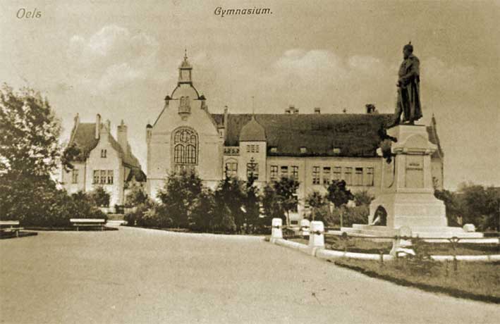 Gimnazjum i pomnik cesarza Fryderyka III. Na ścianie szczytowej budynku widoczny jest witraż, dalej opisany. Z lewej dom dyrektora, za nim ogród botaniczny i sala gimnastyczna |