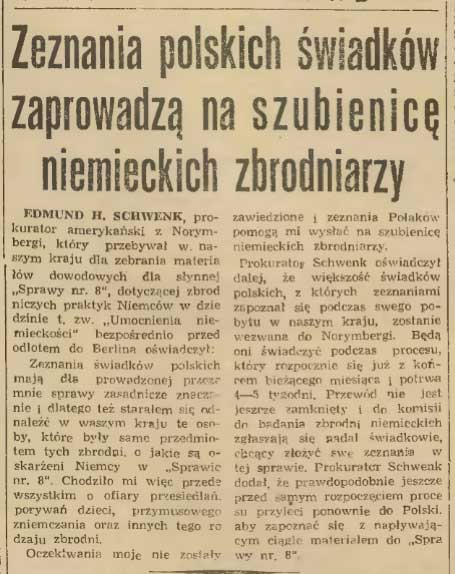 W numerze 232 gazety "Życie Warszawy" z dnia 24 sierpnia 1947 roku można odnaleźć relację z pobytu Heinza Swchenka w Polsce - jak się wydaje Heinz podróżował wtedy po Polsce w poszukiwaniu dokumentów i świadków, których historie mogłyby stanowić podstawę oskarżenia w procesie.