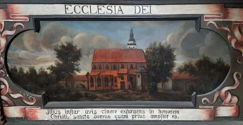 Empora zachodnia (pod organami) na Rys 1. (oznaczona cyframi 1-5) miała przed 1905 r. dekorację malarską z pięcioma emblematami na parapecie. Po usunięciu loży szlacheckiej pojawiło się miejsce na szósty emblemat (cyfry 1-6 na Rys. 2), na którym namalowano nasz kościół od strony południa, pokazany niżej.