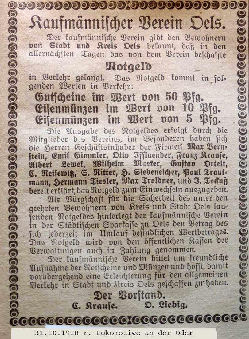 Kilka dni przed zakończeniem wojny Stowarzyszenie Kupców ogłosiło o rozpoczęciu wydawania notgeldów, czyli pieniędzy zastępczych. Ogłoszenie ukazało 31.10.1918 r. i jest ono ważne dla historii oleśnickiej numizmatyki.