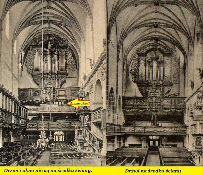 Z lewej widać sytuację sprzed 1905 r. Z prawej - kościól po 1910 r. Okno zostało usunięte.