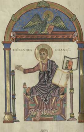 Św. Jana piszący ewangelię, nad nim siedzi orzeł z nimbem, trzymający księgę