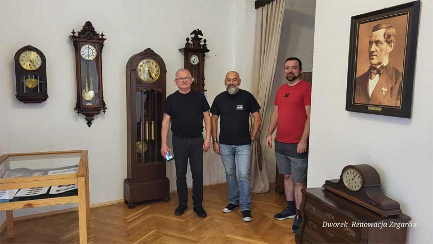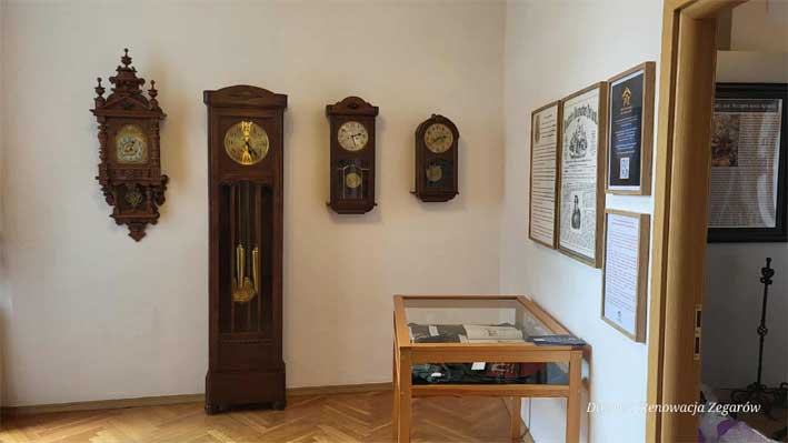 Na ścianach także umieszczono informacje. Drugi zegar z prawej stanowi własność R. Szczuraszka. Został odnowiony w zakładzie P. Łukasińskiego. Fot. R. Szczuraszek |