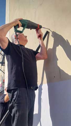 Wojciech Świniarski (prekursor wszystkiego!) wierci otwory pod zawieszenie tablicy |