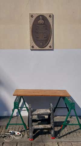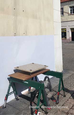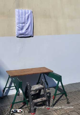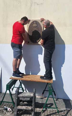 Tablica osłonięta - przygotowana do jutrzejszego odsłonięcia. Zdjęcia wykonywał (i brał udział w pracach) Piotr Łukasiński - prezes Polskiego Towarzystwa Zegarmistrzowskiego i Remigiusz Szczuraszek |