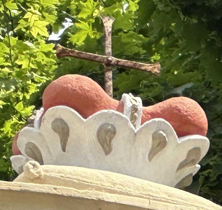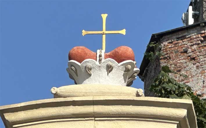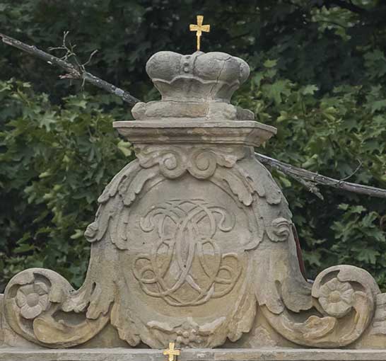 Mitra ze złotym krzyżykiem na bramie wjazdowej do pałacu w Twardogórze. Niżej widać fragment krzyżyka na mitrze nad herbem małżeńskim Sylwiusza Fryderyka i Eleonory Charlotty - właścicielki pałacu |