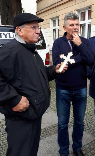 Ksiądz Władysław Ozimek trzyma krzyżyk przed zamontowaniem go na mitrze Kolumny Złotych Godów w Oleśnicy |