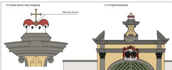 Poniższy tekst dotyczący mitry na krzyżyku nad bramą wjazdową do zamku bierutowskiego opracowano na podstawie informacji Piotra Michalaka. W zeszłym roku zakończyła się renowacja bramy zamkowej w Bierutowie wraz z rekonstrukcją herbu pary książęcej. W ramach prac odtworzono również krzyżyk w zwieńczeniu mitry książęcej. Zgodnie z projektem miał być pozłacany, co widać na poniższym fragmencie projektu kolorystyki.