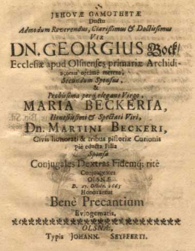 Zawiera ona wpisane gratulacje (wiersze) przychylnych mu osób - głównie duchowieństwa, mieszczan i szlachty, Byłi nimi: Karol Ortlob - superintendent ur. w Oleśnicy w 1628 r. organizator szkolnictwa oleśnickiego i autor podręczników (m.in. czytanki Oelsnisches Lesebuch - 1657 r.); Pastor Mateusz Muscalius z Ligoty Polskiej - bliski znajomy Bocka; Daniel Milichius, a także nauczyciele gimnazjum oleśnickiego - Paweł Poligonius, Zachariasz Rholeder i Szymon Gunterus, Jeremiasz Tierenberger - prawnik oraz kantor Zachariasz Fiedler (o którym pisałem przy okazji muzyki w Oleśnicy). Naturalnie wpisali się też brat Jan Bock, oraz trzej synowie Jerzego - Chrystnian, Samuel i Jan [12]. Broszura jest dostępna w Śląskiej Bibliotece Cyfrowej. Znalazł ją Remigiusz Szczuraszek.