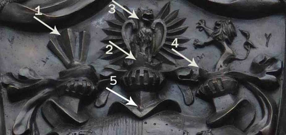 Rys.2. Wyżej widać 3 klejnoty herbowe z herbu Solms-Laubach. Każdy z nich ma jakąś wadę opisaną wcześniej na tej stronie. Naprawa wspomniana przez WKZ ma polegać tylko na wymianie klejnotu oznaczonego numerem 1.