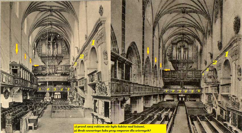 Na Rys. 1 z lewej widać (przed 1905 r.) na piętrze lożę książęcą oraz dalej na przedłużeniu loże znaczącej szlachty (związanej blisko z książetami). Prawdopodobnie do loży książęcej było przebite przez ścianę jedno wejście. Za lożami nie było widać dużych otworów ostrołukowych lub łukowych. Do loży szlacheckiej mogło być wejście z zachodniej najniższej empory (tej pod organami). W trakcie katastrofy budowlanej w 1905 r. te ściany i loże uległy zawaleniu. W trakcie odbudowy kościoła w latach 1907-1910 nie odbudowano lóż, a w nowej ścianie wykonano trzy otwory ostrołukowe - wskazane strzałkami na Rys. 2.