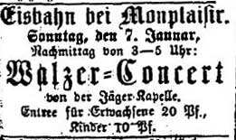 Tor lodowy przy Monplaisir Niedziela, 7 stycznia 1884 r. po południu od 15:00 do 18:00: Koncert walców w wykonaniu orkiestry Jegrów. Wstęp dla dorosłych 20 fen., dzieci 10 fen. |
