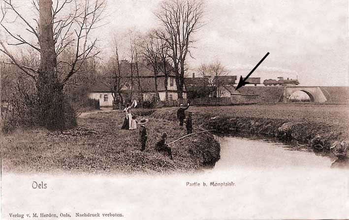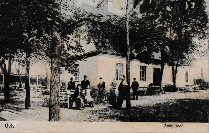 Na widokówce widać budynek (grupę budynków, teren) określany jako Monplaisir (Moja przyjemność). Podpis pod nim jest następujący - Das alte Ausflugs- und Erholungsgebiet im Western der Stad Oels, ehemals herzogliches Kaffeehaus Monplaisir. Czyli - stary teren wycieczkowo-rekreacyjny w zachodniej części miasta Oels, dawniej książęca kawiarnia Monplaisir.
