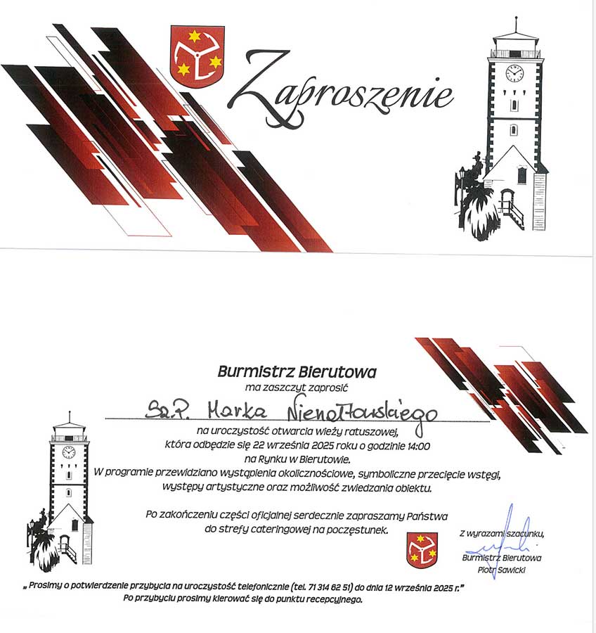 | 16.09.25 | Zostałem przed miesiącem zaproszony przez burmistrza Bierutowa Piotra Sawickiego na uroczystość otwarcia wieży ratuszowej. Warto przyjechać do Bierutowa i zobaczyć odnowioną bramę zamkową i wieżę. Życzę mieszkańcom Bierutowa, aby udało się do wieży dobudować budynek Ratusza. | ||