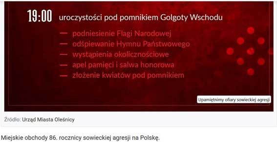 Urzędnicy z Ratusza bez żadnej wiedzy o fladze Rzeczypospolitej zapraszają mieszkańców pod pomnik Golgoty Wschodu W innych miastach pod podobne pomniki zapraszają na złożenie kwiatów i zniczy, bo są bardziej odpowiednie do upamiętnienia |