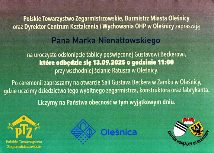 | 08.09.25 | W sobotę (13.09.2025 r.) odbędzie się w Rynku w Oleśnicy odsłonięcie tablicy poświęconej Gustavowi Beckerowi oraz otwarcie sali G. Beckera w zamku oleśnickim. Odbywa się to tylko dzięki Polskiemu Towarzystwu Zegarmistrzowskiemu. Pomysłodawcą tego zdarzenia jest Wojciech Świniarski, były mieszkaniec naszego miasta, o którego działaniach pisałem w tym i przeszłym roku. | + |