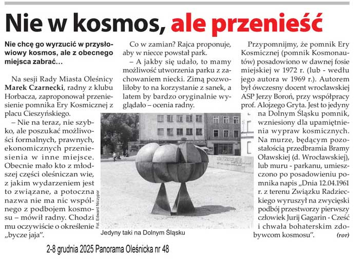 Pogląd radnego Marka Czarneckiego na temat pomnika Ery Kosmicznej z ok. grudnia 2025 r.