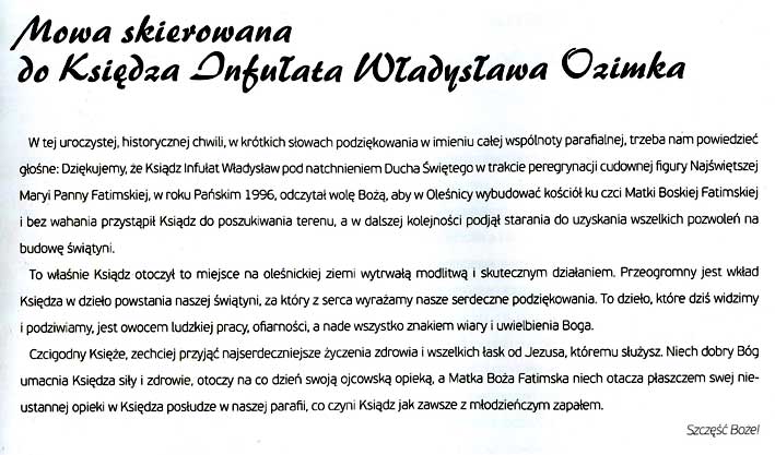 Mowa wspólnoty parafialnej skierowanej do ks. infułata Władysława Ozimka: